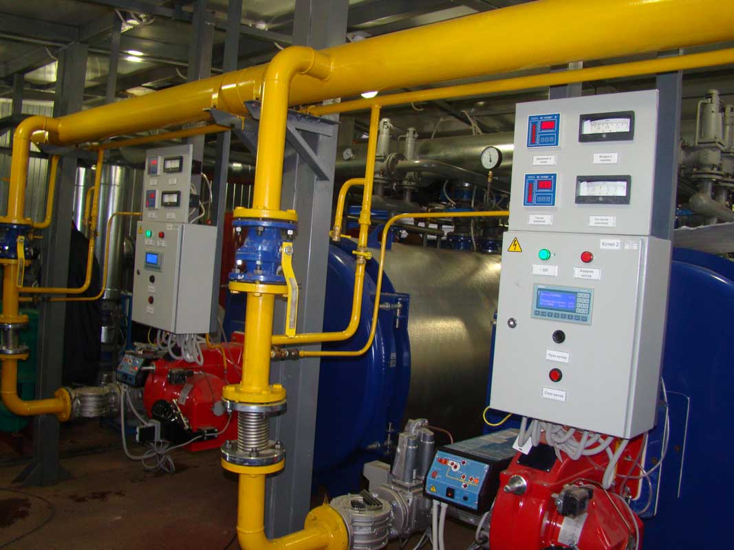 Обе котельные располагаются на территории завода ОАО ВНПО «Ресурс» (бывший Вяземский завод графитовых изделий ОАО «Юкар-графит»). Котельная мощностью 1 МВт отапливает административное здание заводоуправления, а мощностью 3 МВт отапливает цех механообработки. По технологической схеме котельные практически не отличаются друг от друга. Предназначены только для отопления помещений (без горячего водоснабжения). В каждой котельной установлено по два водогрейных котла с двухступенчатыми газовыми горелками. Теплоноситель циркулирует по внешнему контуру отопления и по внутреннему (котловому). Для управления котлами в каждой котельной установлено по два щита автоматизации водогрейных котлов ЩАК1.0, работа которых реализована на базе программируемых логических контроллеров ПЛК100, модулей ввода аналоговых МВА8 и панели оператора ИП320 (работа щита ЩАК1.0 описана здесь). В дополнение к щитам ЩАК1.0 был применен щит управления общекотельным оборудованием, также реализованным на базе программируемого логического контроллера ПЛК100.
