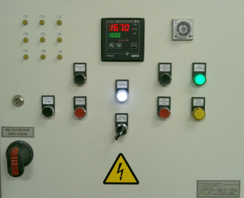 Применения — Машиностроение и металлообработкаЩит управления печи полимеризации с контролем каждого ТЭНаКомпания «АТБ Электро» (г. Санкт-Петрбург) разработала и реализовала новое решение – щит управления печи полимеризации с контролем и индикацией работы каждого ТЭНа. Задача автоматизацииВ задачу автоматизации входила разработка типовой системы управления и поддержания температуры в печи полимеризации. Установленная мощность - 45 кВт (9ТЭН × 5 кВт). Особенностью задачи стало желание клиента получить визуальный контроль работы/перегорания каждого ТЭНа в отдельности. Данная задача актуальна для предприятий, эксплуатирующих печи с небольшим количеством ТЭНов, когда выход из строя любого из них может серьезно повлиять на инерционные характеристики работы всей печи. РешениеВ результате при реализации проекта помимо стандартных требований (контроль и поддержание заданной температуры; контроль времени цикла; визуальный контроль работы основных агрегатов) была реализована функция визуального контроля работы и перегорания каждого ТЭНа. Теперь для визуальной проверки работы или перегорания ТЭНов достаточно нажать на кнопку «Проверка работы ТЭНов». Регулирование температуры реализовано с применением измерителя-регулятора двухканального с RS-485 ОВЕН ТРМ202. Два канала задействованы с целью контроля равномерности нагрева печи в ее противоположных концах.