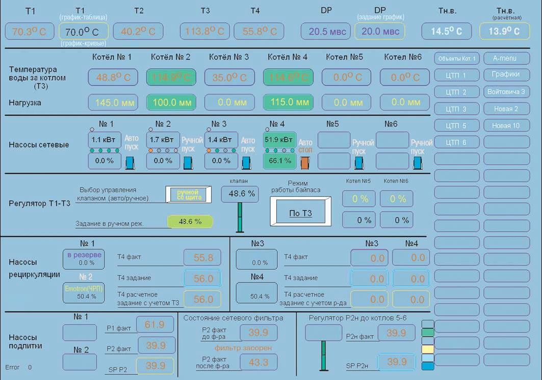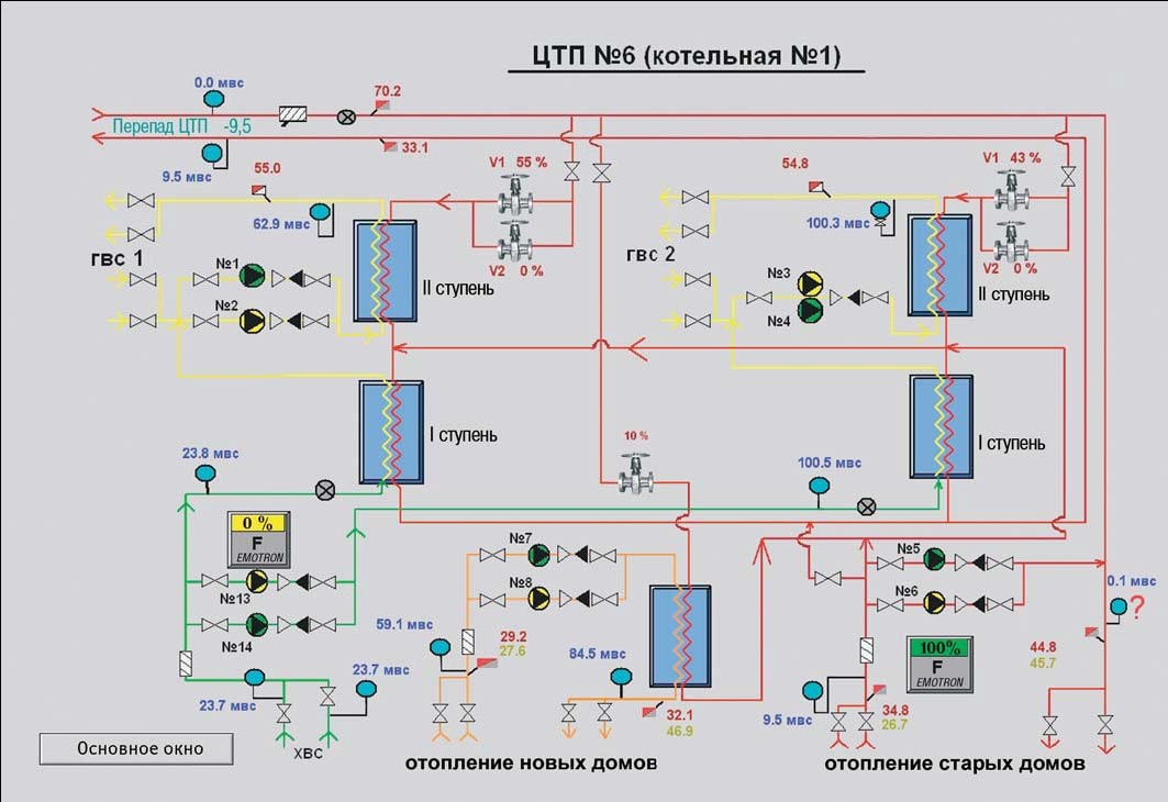 - А как же управление производительностью котлов и перепадами давления в теплосети, которое, как вы сказали, идёт по рассчитываемым графикам? - Методика количественно-качественного регулирования стала основой для программ, работающих на наших программируемых контроллерах. Используя прогнозы погоды и результаты замеров температуры наружного воздуха, мы превращаем их во вводимые вручную таблицы, на основе которых программа выдаёт данные для управления котлами и сетевыми насосами. Хочу подчеркнуть, что программный расчёт данных и их передачу на контроллеры, управляющие оборудованием котельных и теплопунктов, выполняет специалист - инженер (диспетчер до этой работы не допущен). Благодаря использованию расчётной методики и тщательному вводу данных мы добились значительной экономии топлива и не менее ощутимого экономического эффекта. Не менее силён экономический эффект, получаемый за счёт точной настройки тепловых пунктов. В качестве примера обратимся к мнемосхеме ЦТП №6, представленной на рис. 2. На ней с точностью до десятых долей градуса показана температура воды, так же точно отображается давление, очень важно и обозначение всех регулируемых клапанов. Имея перед глазами столь точный инструмент дозировки тепла, диспетчер получает мощнейший инструмент экономии теплоэнергии.
