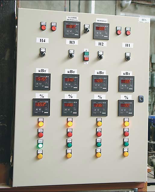 - А как работает этот щит управления? - Он дублирует управление из диспетчерской. На индикаторах видны текущая мощность и частота питания в процентах, а также перепад давления в сети (разница между давлением на выходе из котельной и в обратной магистрали). Величина перепада зависит от температуры наружного воздуха и задаётся на основании графика, построенного для данной котельной (при помощи переключателя можно переходить на ручное управление). Мы научили автоматику поддерживать заданное значение перепада с точностью в 0,01 атмосферы. Необходимо отметить, что графики для реутовских котельных рассчитываются по методике количественно-качественного регулирования, которую в 1998 году разработали по нашему заказу специалисты Московского энергетического института. Эта разработка экономит нам большое количество топлива. - Получается, что с этого щита можно управлять не только насосами, но и температурой в городских домах? - В принципе да. Если по каким-либо причинам диспетчерская выйдет из строя, то отсюда можно будет управлять и гидравликой теплосети. Переходя на язык военных, можно сказать, что щит управления насосами служит для нас резервным командным пунктом. Остаётся добавить, что изделия компании ОВЕН обслуживают и другие агрегаты этой котельной, а также других объектов нашего предприятия: следят за уровнем жидкостей, защищают электродвигатели, контролируют и регулируют температуру и другие параметры, собирают данные для систем управления и диспетчерских. Приборы ОВЕН применяются у нас с 1999 года, специалисты нашего предприятия убедились, что работают они надёжно. - Если я правильно вас понял, Реутовская теплосеть имеет несколько систем управления и диспетчерских? - Дело в том, что сбои в работе теплосети чреваты опасностью возникновения аварий и перерасхода топлива, поэтому, автоматизируя предприятие, мы постарались минимизировать риски. Для этого нам пришлось приступить к обустройству независимой системы управления каждым объектом теплосети. В ходе этой работы мы стали ставить в котельных, на индивидуальных и центральных теплопунктах современную автоматику, использующую свободно программируемые контроллеры. Кроме регулирования температуры отопления и контура горячей воды, автоматика поддерживает необходимое давление воды, переключает основные и резервные насосы, контролирует обратную магистраль. Сейчас мы хотим добавить к этим функциям управление задвижками с электроприводами и контроль теплотрасс. - Почему автоматика управления объектами построена не на персональных компьютерах, а на контроллерах? - В 1997 году, выбирая средства автоматизации, мы добивались того, чтобы тепловые пункты работали без персонала. Естественно, что мы выбрали устройство, занимающее небольшую часть шкафа управления объектом, не требующее присмотра и специально предназначенное для выполнения таких задач. Это программируемый контроллер, который осуществляет три функции: