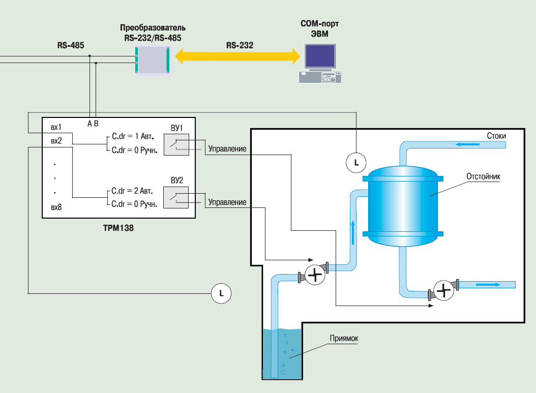 Принцип работы измерителя-регулятора ОВЕН ТРМ138ТРМ138 включает в себя несколько уровней программирования, каждый из которых содержит группу параметров, отвечающих за определённые настройки прибора. Уровни1 PL–0, PL–1, PL–2 включают в себя параметры общего назначения, обработки сигналов датчиков и логических устройств соответственно. Основные параметры, влияющие на работу прибора, находятся на уровнях PL–1 и PL–2. Существует ещё один параметр, не вошедший ни в один из описанных выше уровней – dr.dG, который отвечает за состояние выходного устройства канала регулирования. Под каналом регулирования подразумевается взаимодействие входного (В), логического (ЛУ) и выходного (ВУ) устройств прибора. Выходные устройства предназначены для согласования сигналов управления (сформированных логическими устройствами) с внешним оборудованием. Для формирования канала управления к выбранному логическому устройству подключается входное устройство, а к его выходу присоединяется одно из выходных устройств прибора, порядковый номер которого задаётся параметром: C.dr = n, где n = 0…8. В случае работы прибора ТРМ138 в автоматическом режиме за каждым логическим устройством закреплены входное (или несколько входных) и выходное устройства, при этом параметр C.dr логического устройства должен быть равен n, где n = 1…8. Например, для второго канала регулирования (В2 →ЛУ2 →ВУ2) C.dr = 2. Для изменения режима управления выходным устройством и перевода из автоматического режима в ручной достаточно поменять значение параметра C.dr логического устройства, связанного с соответствующим выходным устройством. Например, чтобы пользователь мог вручную управлять выходным устройством по интерфейсу RS-485, ни одно логическое устройство прибора не должно ссылаться на соответствующее выходное устройство (В2 →ЛУ2 →ВУ2), а значение параметра в этом случае равно: C.dr = 0. Этим принципом руководствовались специалисты отдела АСУ ТП ОАО «ХИМПРОМ» при организации работы каналов регулирования системы управления узлом откачки сточных вод. В случае управления насосом в автоматическом режиме выходное устройство, отвечающее за работу данного насоса, закреплено за соответствующим логическим устройством. В этом случае структурная схема выглядит так, как показано на рис. 2а. Если возникает необходимость выполнять ручное управление исполнительным механизмом, то, используя SCADA-систему (изменение параметров осуществляется по встроенному цифровому интерфейсу RS-485), связь между выходным и логическим устройствами измерителя-регулятора ТРМ138 разрывается (C.dr = 0) (рис. 2, б) и выходным устройством управляют напрямую – путём изменения значения параметра dr.dG.