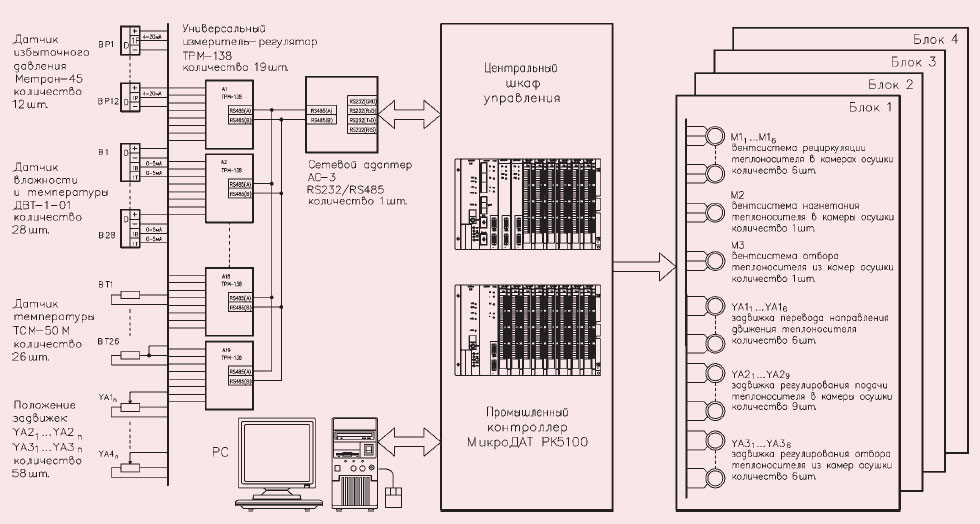 Производство строительного керамического кирпича – сложный, непрерывный и энергоемкий процесс. Технологический процесс осушки кирпича включает в себя измерение и регулирование таких параметров, как влажность, температура и давление. Предлагаемая система управляет четырьмя блоками сушильных камер при помощи 152 каналов измерения (54 канала измерения температуры, 28 каналов измерения влажности, 12 каналов измерения давления, 58 каналов измерения задействованы для контроля положения клапанов регулирования), 116 каналов управления (управление 32 вентиляционными системами – подача и рециркуляция сушильного агента, управление 84 клапанами регулирования и перевода направления движения сушильного агента) и 224 каналов ввода. Структурная схема системы управления сушильными камерами отображена на рис. 1. Для измерения давления были использованы датчики избыточного давления Метран-45, для измерения влажности и температуры (28 каналов), датчик измерения влажности и температуры ДВТ-01. Для 26 каналов измерения температуры были использованы датчики температуры ОВЕН ТСМ-50М. Для контроля положения клапанов и сбора данных с датчиков были использованы 19 универсальных измерителей-регуляторов ОВЕН ТРМ138. Выбор ТРМ138 был основан на необходимости применения именно универсального измерителя с возможностью передачи данных на расстояния более чем 200 м.