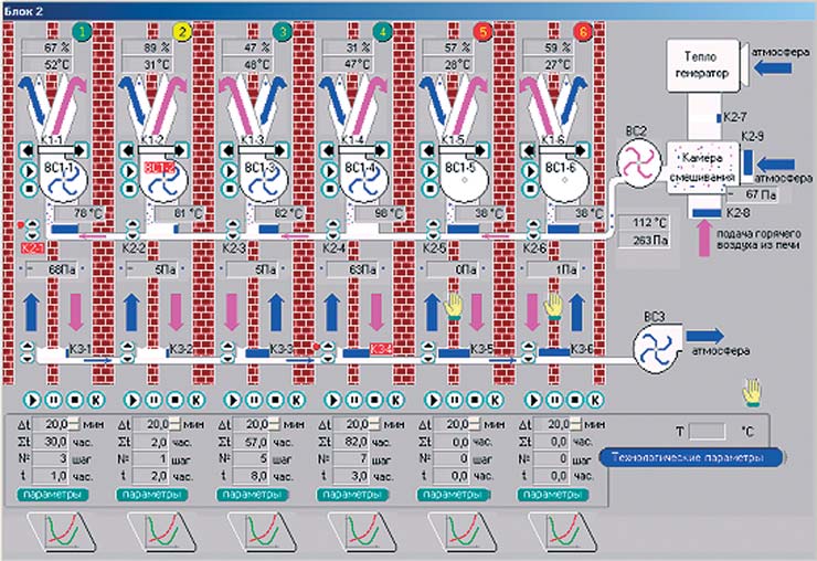 ПО «ОВЕН» давно зарекомендовало себя на рынке средств автоматики как производитель недорогого, удобного в эксплуатации и надежного оборудования. Технологические параметры, собранные при помощи интерфейса RS-485, обрабатываются промышленным контроллером МикроДАТ РК5100, который управляет исполнительным оборудованием (клапаны и вентсистемы). Пульт управления технологическим процессом создан на базе персонального компьютера. Оператор управляет технологическим процессом сушки кирпича-сырца на базе SCADA Expert2000 разработки ООО «Енисей-Автоматика» (рис. 2). Через экранные формы 4-х блоков осушки можно управлять системой в ручном режиме работы, задавать алгоритмы и параметры технологического процесса для автоматического режима работы, и контролировать протекание процесса сушки по графикам (рис. 3). Выбранные современные технические средства и программное обеспечение позволили значительно снизить трудоемкость в производстве, улучшить качество выпускаемой продукции и добиться снижения его себестоимости.