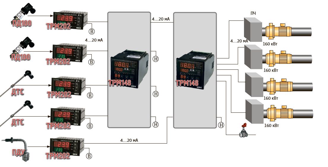 Почему ОВЕН?Основу автоматизированной системы управления составляют приборы ОВЕН. Выбор этой продукции был сделан по нескольким причинам. Первая – и самая главная – это то, что отечественный производитель ОВЕН выпускает высокотехнологичную продукцию, проверенную многократно в различных системах, начиная от самых простых и заканчивая сложными распределительными системами. Немаловажным фактором для многих проектных организаций является и то, что ОВЕН имеет свои представительства, сервисные и инженерные центры во всех промышленных центрах России, где можно в любой момент, как явочным порядком, так и по телефону получить исчерпывающие консультации по установке, программированию и наладке оборудования. Теперь несколько слов о том, что касается удобства самих приборов. В данном проекте универсальный ПИД-регулятор ТРМ148 позволяет обрабатывать в программно-логическом поле восемь независимых и разномасштабных сигналов, поступающих от разных датчиков, с последующим выводом на любой из восьми выходных каналов в виде аналогового сигнала тока или «сухого контакта». Эти функции позволили реализовать цепи пропорционального управления производительностью и цепи аварийной сигнализации оповещения нижних и верхних границ контролируемых параметров. У регулятора удобный человеко-машинный интерфейс с русскоязычным конфигуратором, уставки могут изменяться непосредственно на кнопочной панели прибора. Терморегулятор имеет яркую световую индикацию с хорошо различимыми цифрами, что позволяет обслуживающему персоналу без напряжения наблюдать за технологическими параметрами с большого расстояния. При необходимости есть возможность интеграции прибора в единую систему диспетчеризации посредством встроенного интерфейса RS-485.