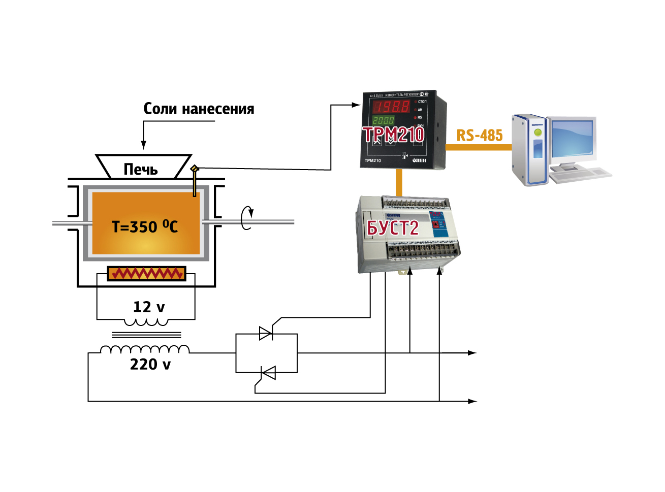 Для начала проведем небольшой экскурс в технологию подготовки старта. Компоненты топлива – горючее (керосин) и окислитель (жидкий кислород) поступают из баков на центробежные насосы, приводимые в движение газовой турбиной. Рабочим телом газовой турбины является водокислородная газовая смесь, образующаяся при разложении высококонцентрированной перекиси водорода Н2О2 на окисном катализаторе Ж30СО. Под высоким давлением компоненты топлива поступают через форсунки в камеру сгорания, перемешиваются и сгорают, образуя нагретое до высокой температуры газообразное рабочее тело, которое, расширяясь в сопле, совершает работу и преобразует внутреннюю энергию газа в кинетическую энергию направленного движения. Через сопло газ истекает с большой скоростью, сообщая двигателю реактивную тягу. Так вот, нас интересует окисный катализатор Ж30СО, а точнее технология его производства. Технология производства катализатора – многостадийная. Первые две стадии – окисление исходного сырья кислородом воздуха и нанесение солей на высокопористую поверхность катализатора – являются основными и протекают при температурах 500 °С и 350 °С соответственно. От точности соблюдения температурных режимов в большой степени зависит качество катализатора Ж30СО. Эксплуатировавшаяся в течение нескольких десятков лет система позиционного регулирования хотя и оставалась в рабочем состоянии, но не обеспечивала ни требуемой точности параметров процесса, ни надежности. Необходима была полная реконструкция системы регулирования с использованием современных микропроцессорных аппаратных средств с соответствующими характеристиками регулирования и возможностями информирования обслуживающего персонала. Конструкция печи для нанесения солей на пористую поверхность катализатора для безопасности персонала оборудована низкоомным нагревателем на 12 В мощностью 6 кВт, который включен в сеть 220 В через разделительный трансформатор (рис. 1). Аппарат для окисления сырья имеет встроенный активный электронагреватель, включенный по схеме «треугольник» и питается линейным напряжением 380 В (рис. 2). Для обеспечения необходимой производительности в технологической цепочке задействованы два аппарата для окисления сырья и четыре печи для нанесения солей на катализатор. Все печи снабжены ваннами для приготовления раствора солей, которые нагреваются с помощью промежуточного теплоносителя общим индукционным нагревателем до 80 °С. Такое многообразие вариантов нагрева электрическим током с применением различных схем включения нагревателей бесконтактным регулированием (без использования электромеханических контакторов) оказалось под силу только новому блоку управления ОВЕН БУСТ2, который и был использован для этих целей. Для улучшения характеристик регулирования на всех стадиях процесса используются ПИД-регуляторы ОВЕН ТРМ210-ИР. Точность регулирования температуры в процессе нанесения солей составляет ±1 °С (±10 °С при прежней схеме регулирования). Такая точность стала возможна благодаря наличию функции автонастройки, с помощью которой были выбраны коэффициенты, обеспечивающие качество регулирования.